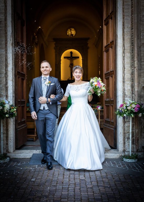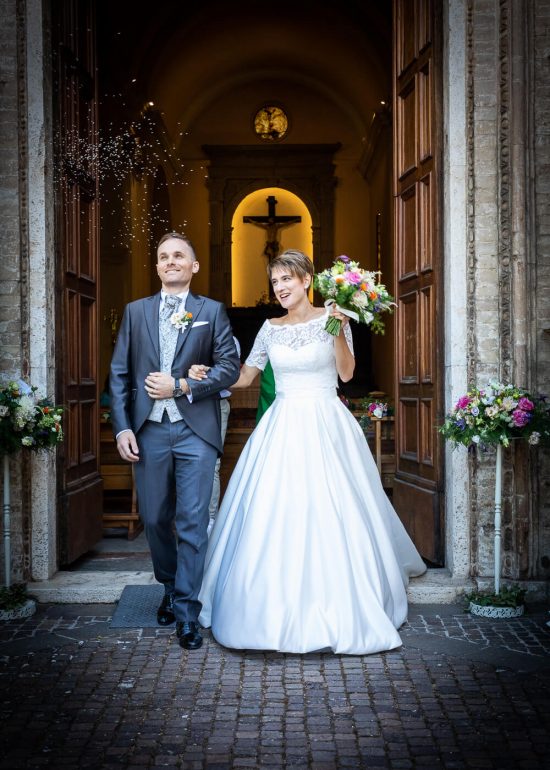 sposi lanciano palloncini bianchi alla fine della cerimonia davanti l'altare